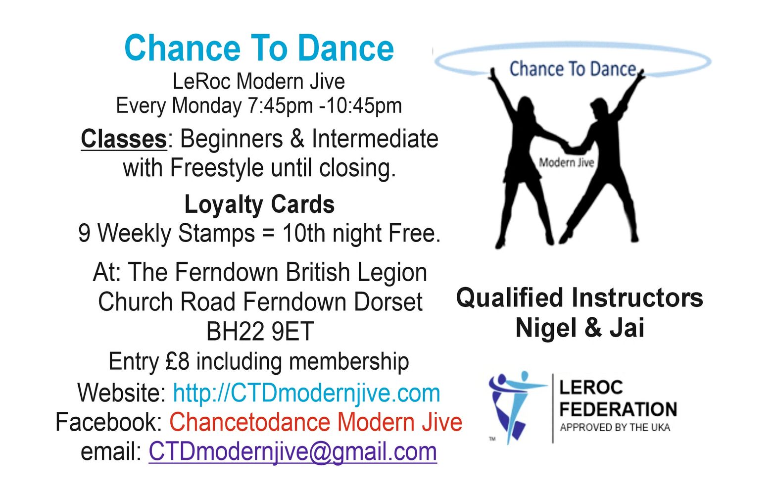 Learn to dance from never danced before to be a competent dancer at the British Legion Ferndown BH22 9ET